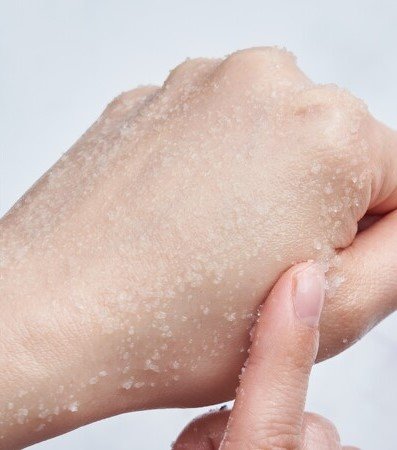 以梘液或香皂潔淨身體後,取一茶匙份量的磨砂以打圈方式在皮膚上按摩,然後沖洗乾淨。適合所有膚質。